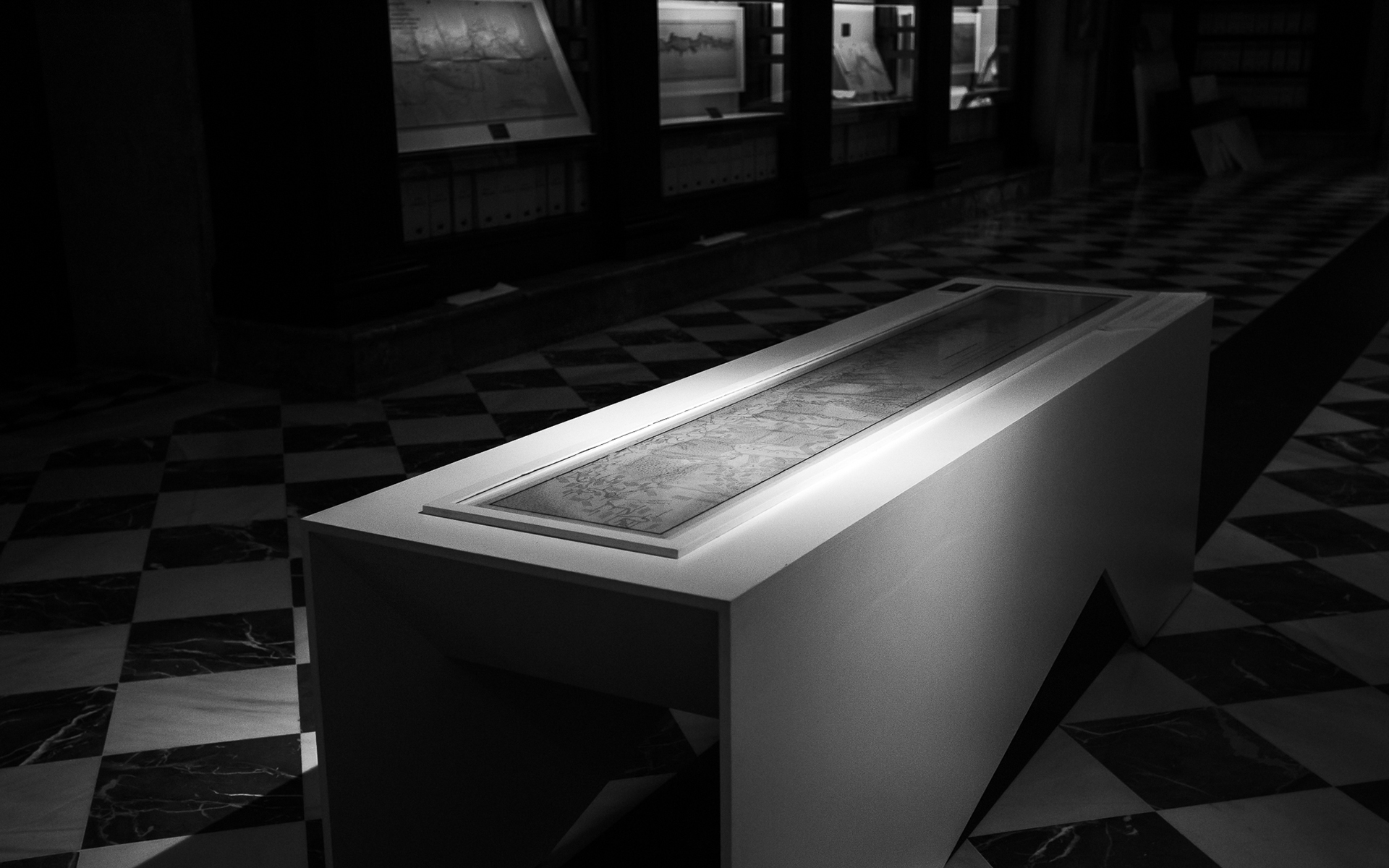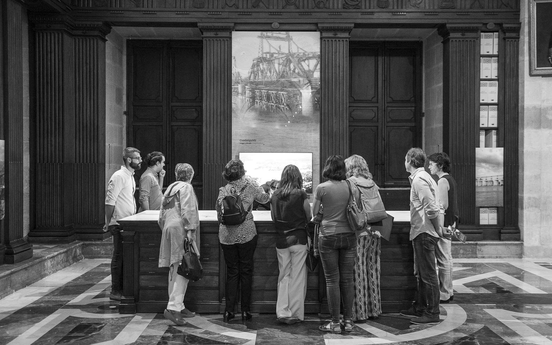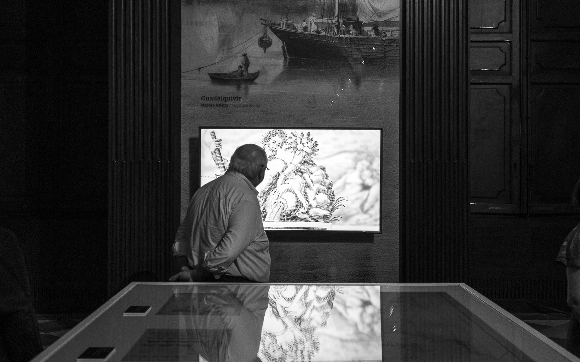 Intervención museográfica para la exposición «Guadalquivir, mapas y relatos de un río», dedicada a la historia y representación del río a través de cartografía, documentos y relatos vinculados a su evolución y al territorio.