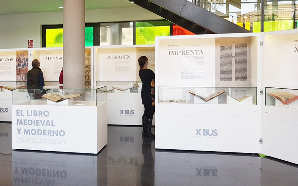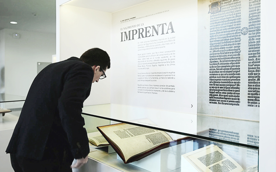 Instalación expositiva y proyecto de comunicación para la Biblioteca de la Universidad de Sevilla, dedicado a la difusión y puesta en valor de su patrimonio bibliográfico histórico.